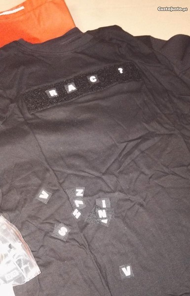 T'shirt preta tamanho M/L; Nova esta camisola tem na frente uma zona com velcro onde se podem colar letras e escrever as mensagens que se quiser inclui as letras! vem ainda dentro de um saco insuflável que se pode transformar numa almofada