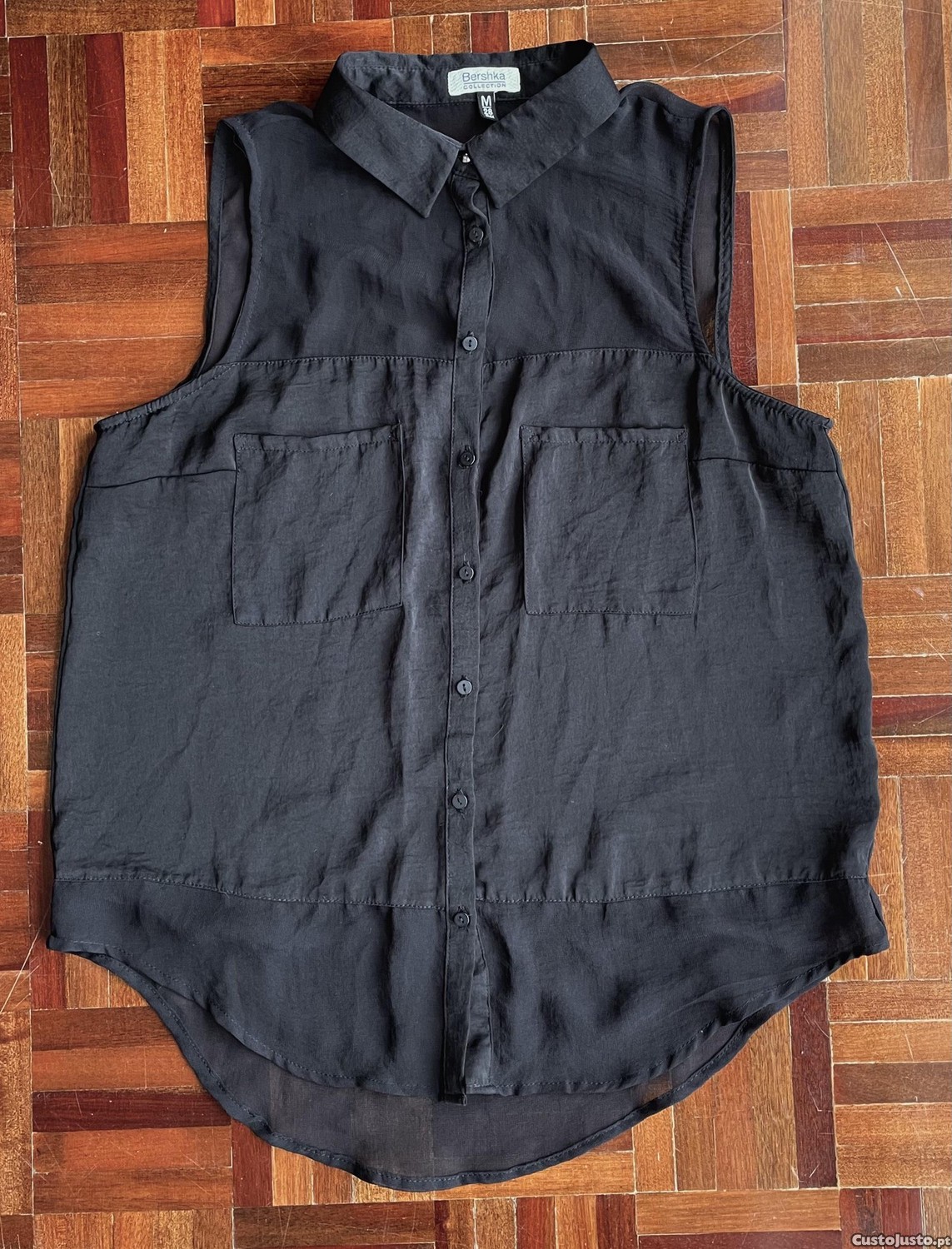 De cor preta. Sem mangas. Aperta como camisa, com pequenos botões pretos. Detalhe de botão prateado no pescoço, na frente e atrás. Tem material translúcido na zona superior e inferior (ver fotos). Material fino, leve e solto.