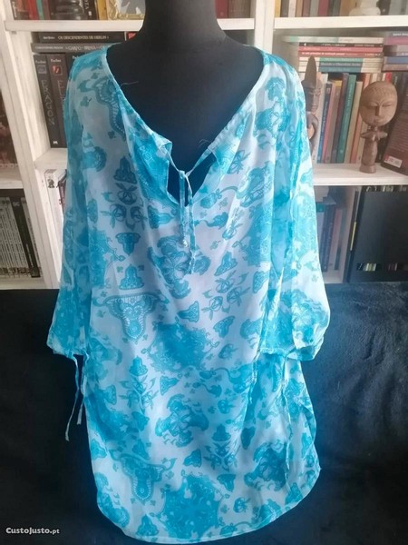 Túnica em voile, tamanhoS/M, em tons de azul, com manga 3/4, fita no mesmo tecido na zona do decote, pequenas rachas nas laterais e também nas mangas, em bom estado, por 5EUR+ portes de envio ou passando a levantar em Rio Tinto junto à igreja matriz.