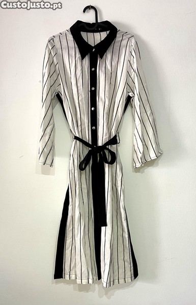 De cor branca, com riscas verticais pretas. De manga solta. Com colarinho preto. Aperta com botões metálicos prateados na frente. Com faixa de tecido para dar nó ou laço. Detalhe de aplique metálico numa das presilhas do cinto. Com rachas laterais e uma frontal (abaixo dos botões).