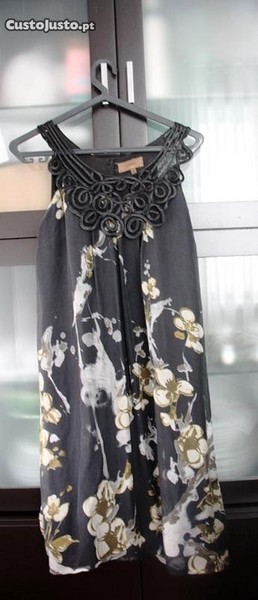 Vestido preto com motivos florais por usar da marca DECENIO. O tamanho é o 34.