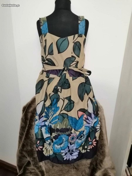 Vestido de alças de tecido, em tons de beje, roxo, azul e verde, tamanho M (sem etiqueta), com drapeado nas costas, fita no mesmo tecido para atar à cinta, forrado, em excelente estado, por 5EUR+ portes de envio ou passando a levantar em Rio Tinto junto à igreja matriz.
