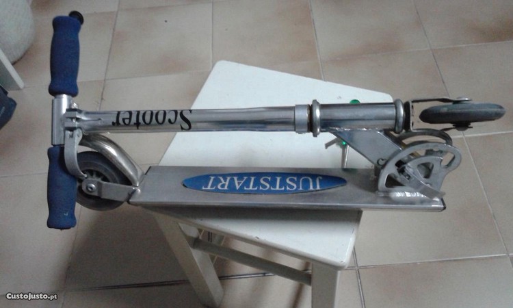 Trotinete em alumino maciço e aço inox. É desmontável para poder ser guardada em qualquer lugar. Como pode ser visto nas 8 fotos. Reajustável para crianças de varias idades devido ao guiador ser ajustável. Está em perfeitas condições pois tem pouco uso.