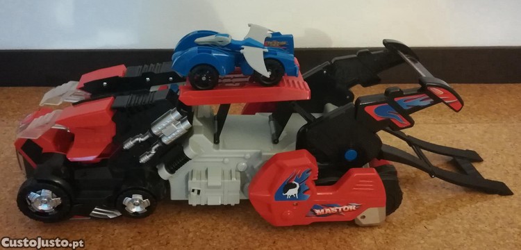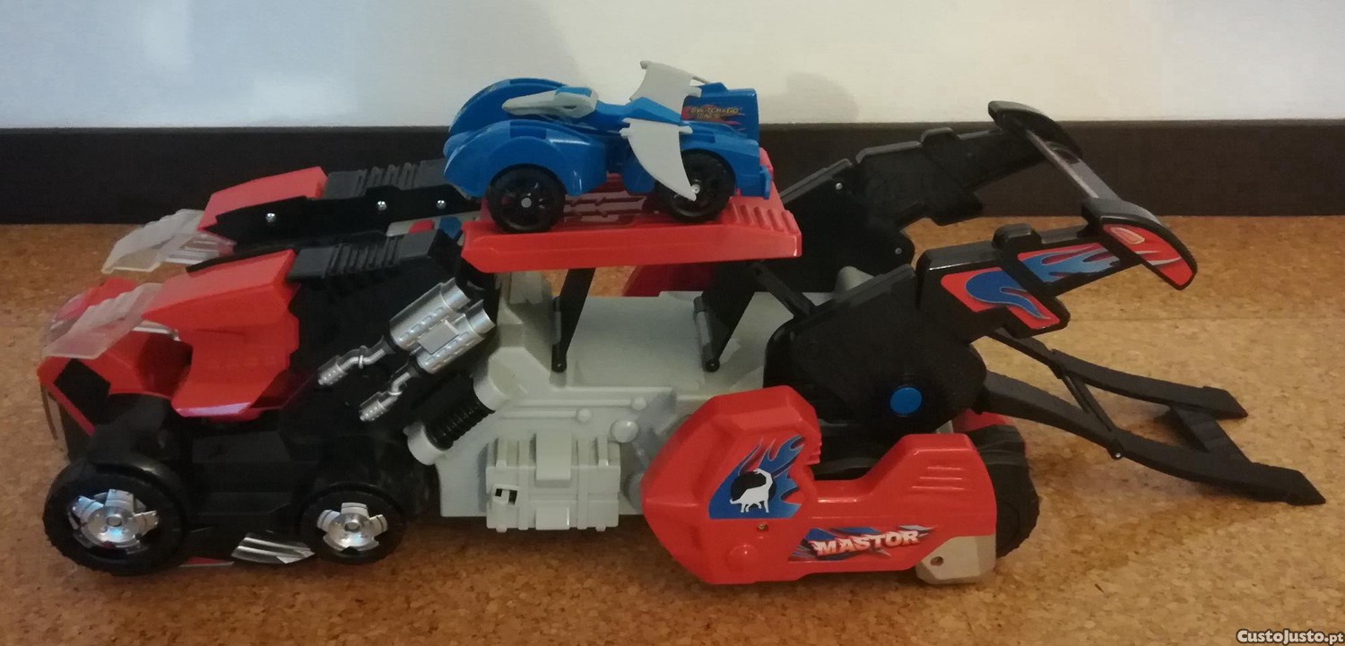 Camião transformer da marca MASTOR com 45cm de comprimento, que se transforma em dragão. Contém um carro mais pequeno azul com um dragão também azul e pista de lançamento. A pista do camião permite lançar o carro pequeno.