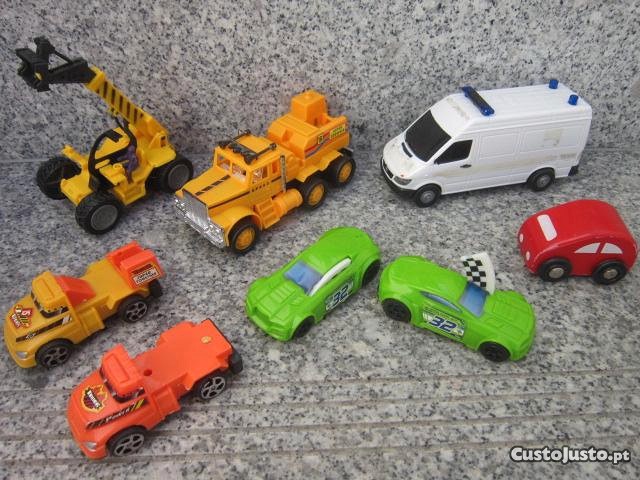 vendo conjunto de vários carrinhos de brincar, retroescavadora, camião, carros de corrida, reboque, etc.