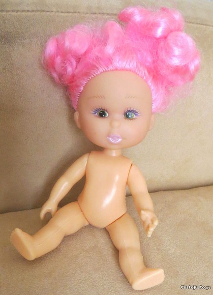 - 1 Boneca c/ cabelo cor-de-rosa, articulada nas pernas, braços e cabeça - Altura: 20 cm