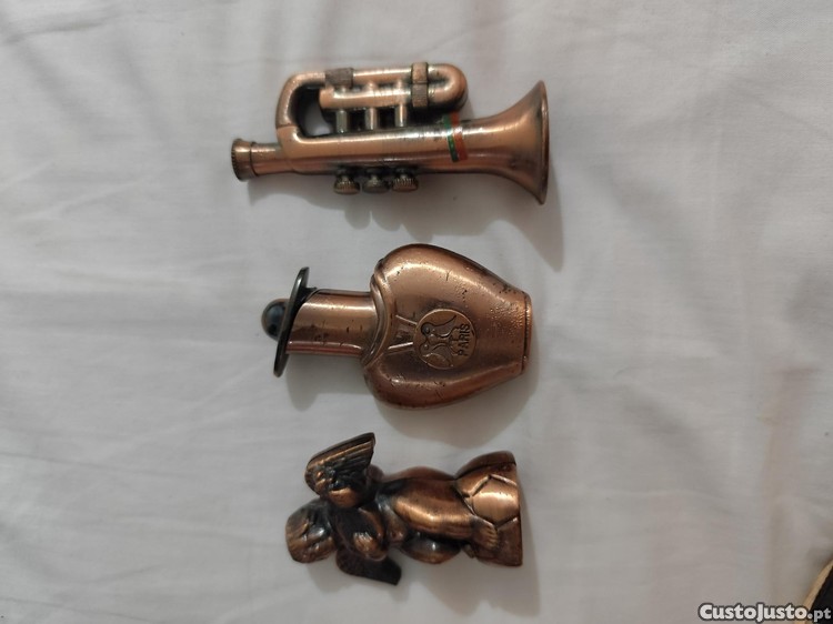 Três isqueiros antigos de metal, para colecionador. Estão em bom estado de conservação. - Isqueiro em forma de trompete - Isqueiro em forma de frasco - Isqueiro em forma de anjo São 3 isqueiros A gás todos Bem antigos Em metal cobreado Um simboliza um anjo a tocar uma pequena viola,tem 6 cm de altura Outro um busto feminino,com chapéu da moda,e inscrição "Paris", tem 6,5 cm de altura,um dos lados com espécie de desgaste/verdete O último é um trompete/clarinete com 8 cm de altura