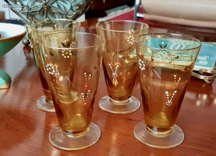 Vidro soprado ou moldado fino em tom ambar translúcido com pintura manual em esmalte colorido motivos florais.