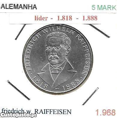 Alemanha - - - 5 Mark - 1968-J - - - Friedrich Raiffeisen - - - Moeda de Prata