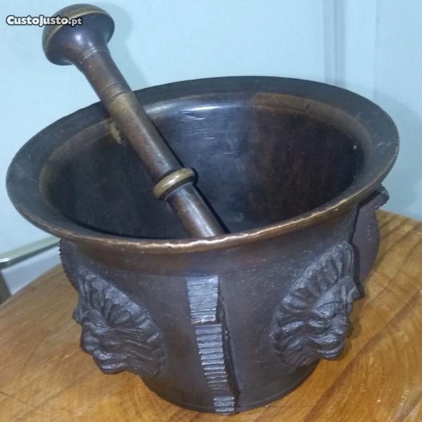 Almofariz em bronze, antigo, com quatro cabeças de leão e pilão.