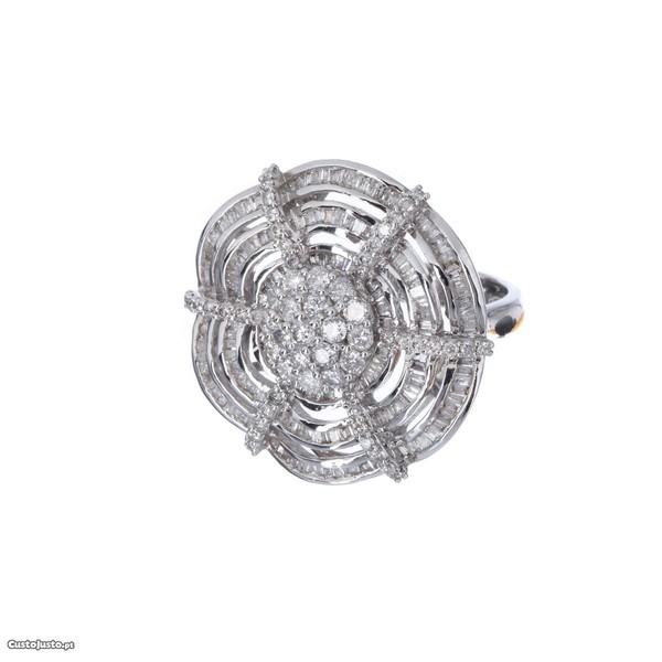 Anel muito bonito em ouro branco de 18 kt, vazado e cravejado com brilhantes e baguetes.