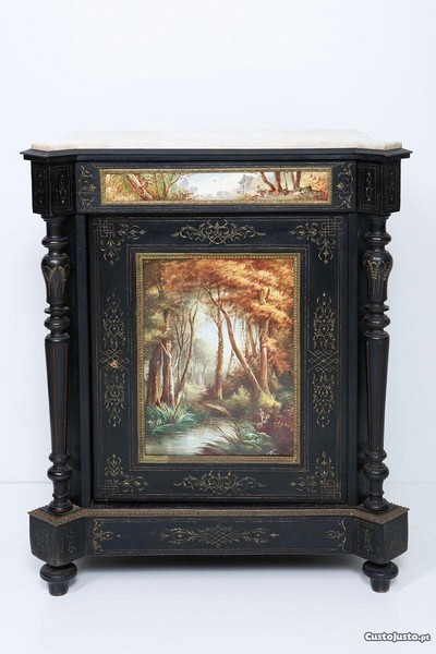 Armário Napoleão III, em madeira ebanizada, decoração incisa com dourados, aplicações em metal relevado e dourado, placas em porcelanas pintada " Paisagens", assinado.