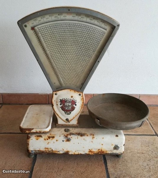 Balança de Mercearia, marca RALHA, fabricada pela Sociedade de Balanças Metais Lda. Peça antiga e a necessitar de algum restauro ou eventual revisão/aferição, pois tem alguns picos de ferrugem, muito embora a balança se encontre a trabalhar bem. Não tem os pesos. Força 15Kg. Mede de altura 66cm. Considerando que se trata de um objecto bastante pesado e com algum volume, só posso entregar em mão.