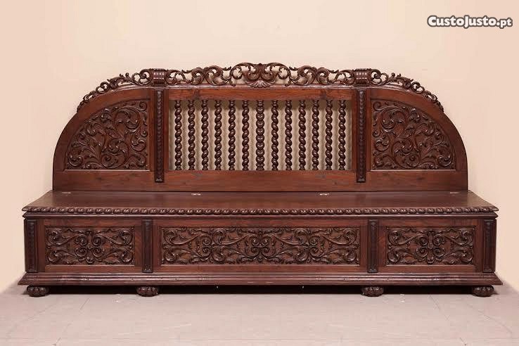 Elegante e sumptuoso banco arca em madeira de castanho, com entalhamentos vegetalistas, costas vazadas com colunas torneadas.