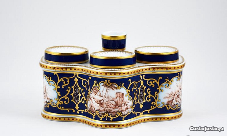 Tinteiro em Porcelana de origem Francesa decorado com três reservas florais e de paisagem a castanho sobre fundo azul cobalto com pormenores ricos a dourado. Composto por três recipientes e pousa pena.