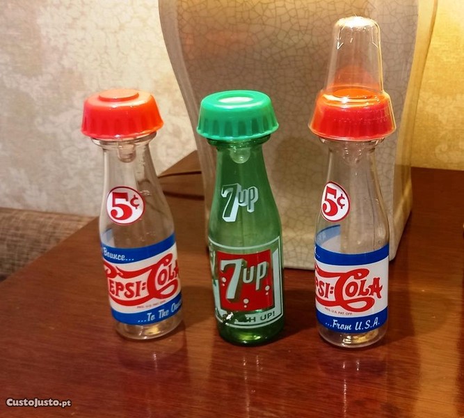 Conjunto de três garrafas com formatos de Biberons e com reclame à Pepsi Cola (duas, mas diferentes entre si) e à 7UP, pela empresa americana Munchkin Bottling Inc.. Terão sido produzidos em meados dos anos 90, de acordo com as datas estampadas (1994) . Com escala até aos 150 ml. Em bom estado de conservação e estético, embora o verde da 7UP apresente um defeito no autocolante Fresh Up, que está ilegível. Os dois da Pepsi nem sequer viram ser tirado o plástico que permite colocar a tetina para fora. Uma tampa superior, apenas, que pode ser aplicada em qualquer um deles. Item de coleccionador. O preço anunciado é para o conjunto. Posso vender individualmente, com preço a combinar.