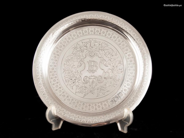 Corpo de formato circular, decorado por cartela central recortada com monograma gravado, ladeado por ramagens, enrolamentos vegetalistas e frisos concêntricos. Aba decorada por faixa com flores, intercaladas por caneladuras verticais, perolados, assente sobre pés recortados e vazados. Bordo decorado por perolados gravados, formando um padrão geométrico repetitivo.