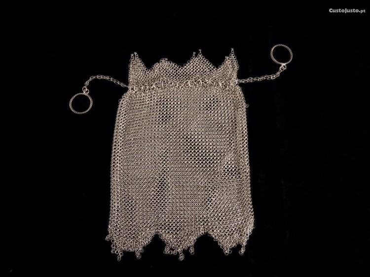 Bolsa de senhora em prata portuguesa Corpo em malha em forma de saco com abertura manual e fecho por sistema de correntes com términos em argolas. Bordo e base, decoradas por faixas recortadas com términos esféricos e fiadas verticais de argolas interligadas entre si em dégradé.