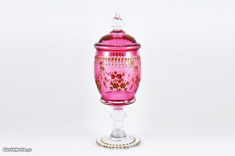 Bomboneira com tampa em Cristal de Murano, decoração em tons de encarnado e dourados.
