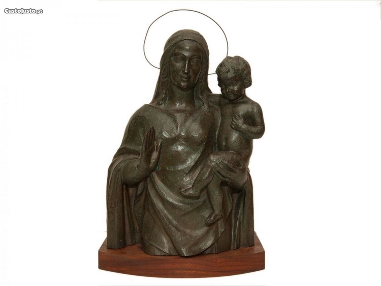 Busto de Nossa Senhora com Menino Jesus ao colo - Escultura em bronze moldado, relevado e patinado. Trabalho do séc. XX. Escultura assinada lateralmente "Henrique Moreira".