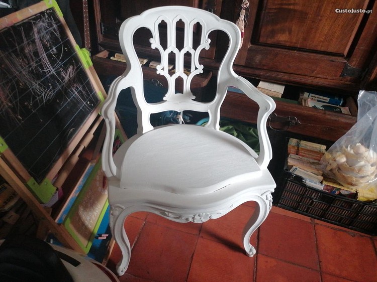 Antigo cadeirão em cerejeira bom estado, pintura branco, posso ainda pôr pele no assento por mais 40 eur.