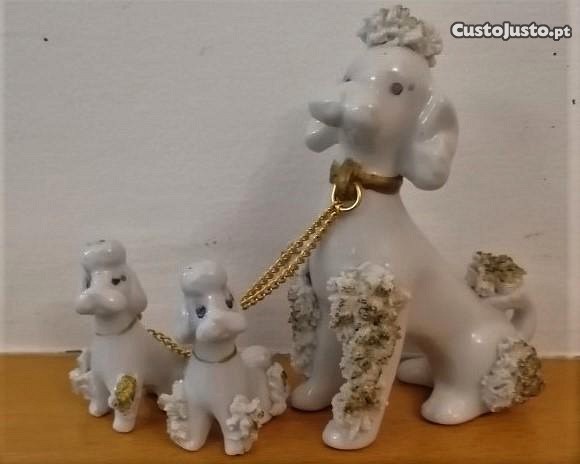 Família de cães "Spaghetti Poodle" dos anos 1950 e 60 - Poodle com filhotes, em porcelana bisque, pintada à mão.
