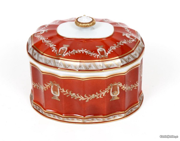 Caixa com Tampa em porcelana portuguesa da Fábrica da Vista Alegre. Decoração manual a coral e ouro com liras.
