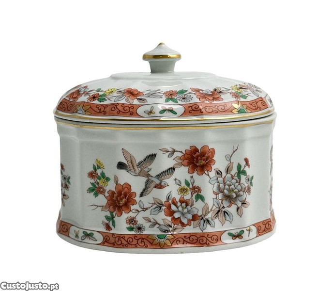 Caixa com tampa em porcelana da Vista Alegre. Decoração "Magnólia", policromada e dourado.