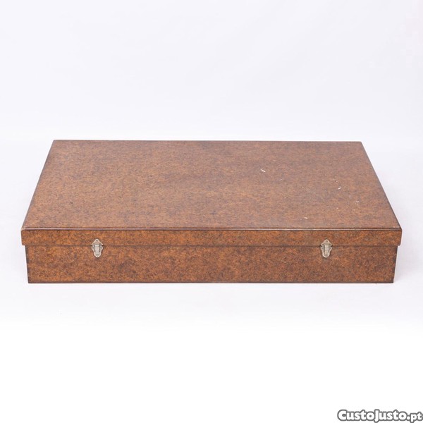 Caixa de enxoval antiga em aglomerado de madeira patinada.