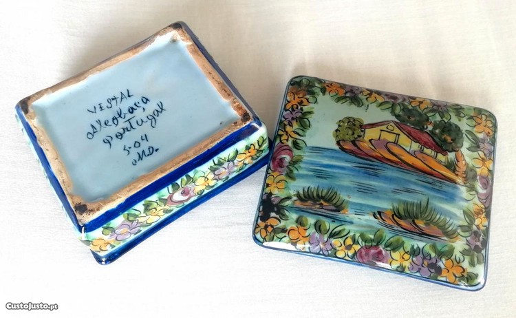 Caixa ou guarda joias da extinta Fábrica de Faianças Artísticas VESTAL Faianças de Alcobaça, Lda., peça muito antiga anterior a 1968 em cerâmica vitrificada e ricamente policromada, as decorações populares características desta louça, em que as flores são elemento dominante sobre os tons de azul e cores berrantes.