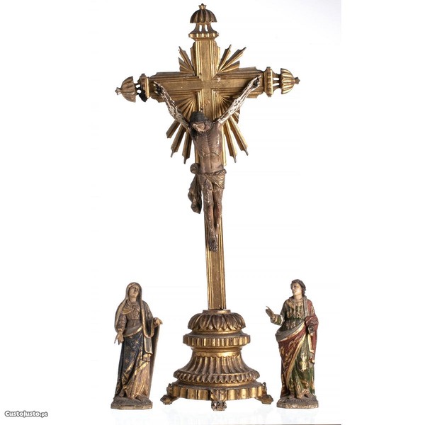 CALVÁRIO Calvário português em madeira entalhadapolicromada e dourada, constituído por Cristo, S. João Evangelista e Maria Madalena. Altura: 68 cm.
