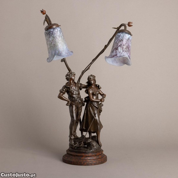 Candeeiro de mesa em bronze de arte com figuras, marcado L & F Moreau.