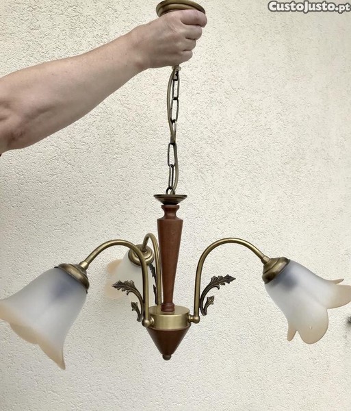 Preço: 10 €Candeeiro de teto antigo em latão, vidro e madeira