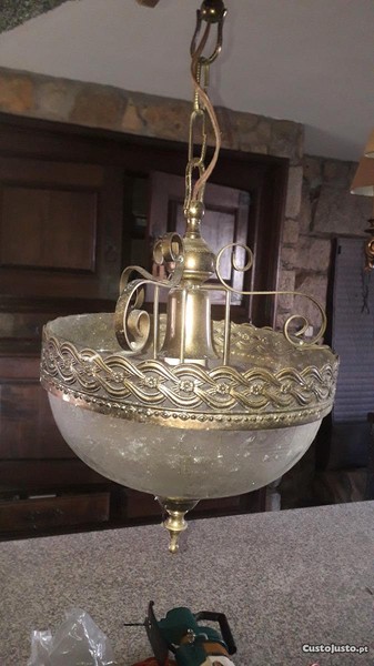 Preço: 40 €Candeeiro de teto antigo em vidro e latão dourado