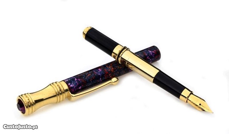 Caneta de aparo Hachette corpo policromado e dourado com aplicação em cristal de Swarovski e aparo banhado a ouro de 24 k. Notas: Com caixa. Nova, sem defeitos