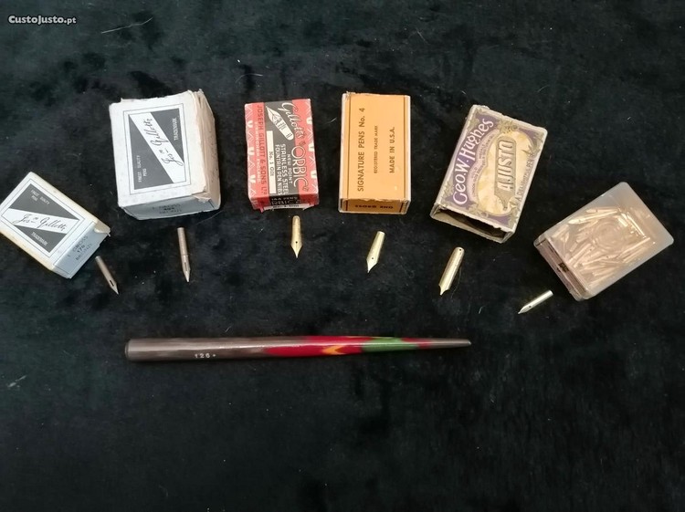 Caneta/pena de aparo em madeira, antiga, n 126, com cerca de 50 anos, em estado NOVO, com os 6 aparos que constam na foto, por 13EUR/cada conjunto + portes de envio ou passando a levantar em Rio Tinto junto à igreja matriz.