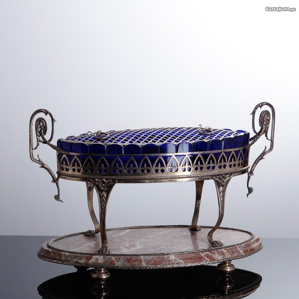 Centro em prata Portuguesa contraste javali, (1887/1937), decoração relevada e vazada com motivos florais, pés de garra, base em mármore e alma em vidro azul.