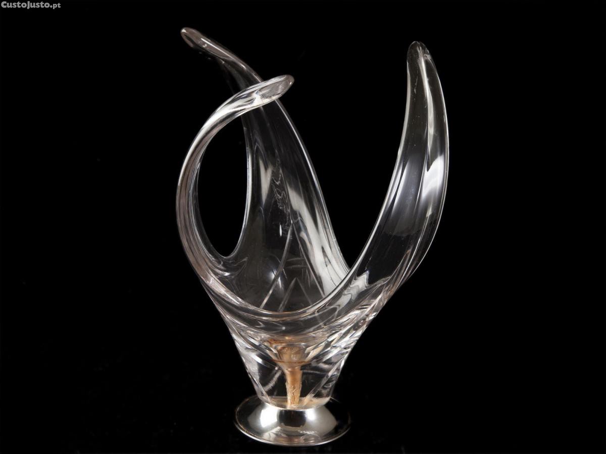 Centro de mesa modernista em vidro moldado e lapidado com base em metal prateado.