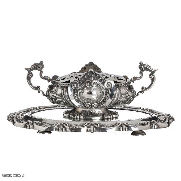 Centro floreira em prata portuguesa, contrastada e marcada, decoração cinzelada e relevada de volutas, concheados e elementos vegetalistas, estilo D. João V. Plateau oval com espelho de cristal.