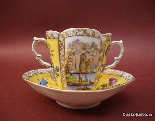 Belíssima chávena chocolateira com respectivo pires em porcelana europeia.