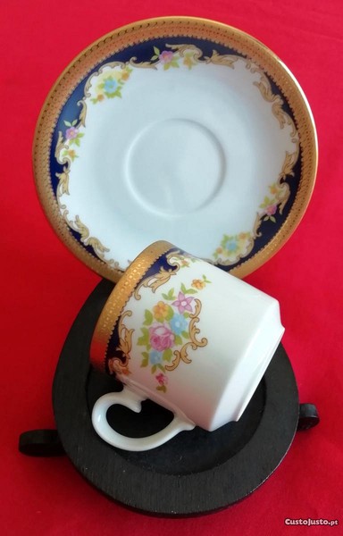 Chávena e pires em fina porcelana com pinturas florais em tons pastel e decoração junto a faixa em azul forte e ouro, no bordo tanto da chávena como do pires apresenta uma faixa generosa toda trabalhada em ouro de 24 Kt, o carimbo na base com a coroa e a marca Tirschenreuth Bavaria a verde mufla provam a autenticidade deste conjunto dos anos 50/60 do seculo passado.