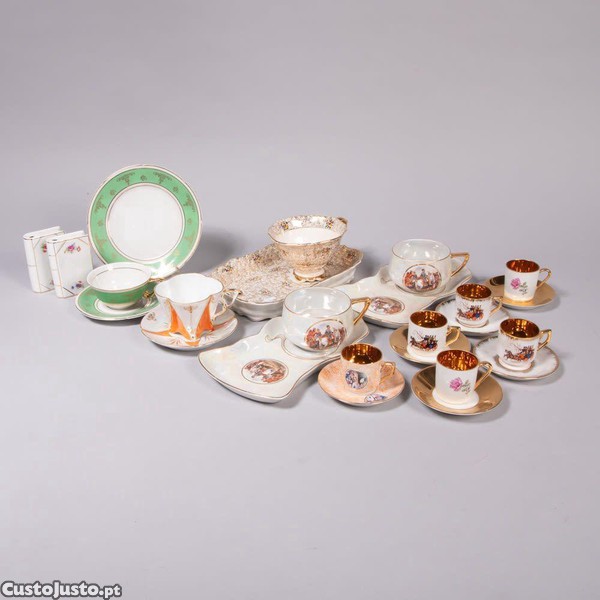 Lote em porcelana composto por: 6 chávenas para café e pires S.P. (Sociedade de Porcelanas), decorações diversas; 2 paliteiros; 3 chávenas almoçadeiras e travessa; Chávena de chá e pires com prato para torradas.