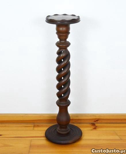 Coluna em madeira para colocação de cachepot, com fuste vazado e torneado.
