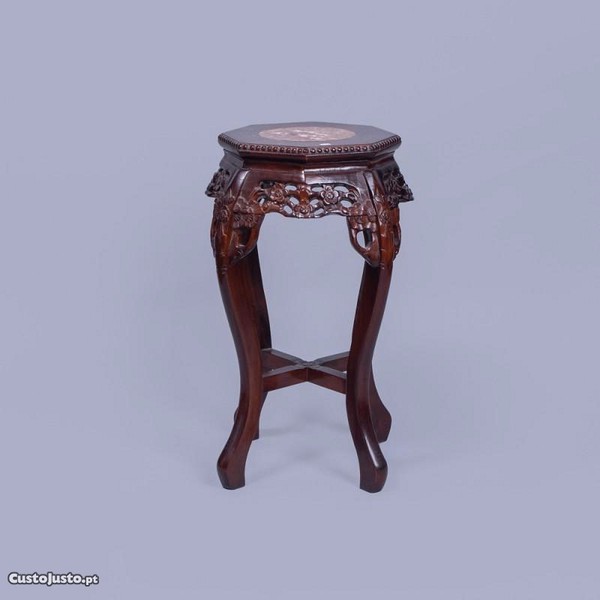 Coluna oriental antiga de suporte, octogonal, em madeira vazada motivo "flores" e pernas torneadas.