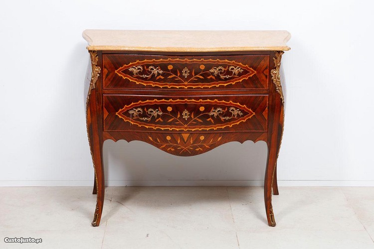 Belíssima Cómoda, Luis XV, com marchetaria em pau santo e pau cetim "flores",