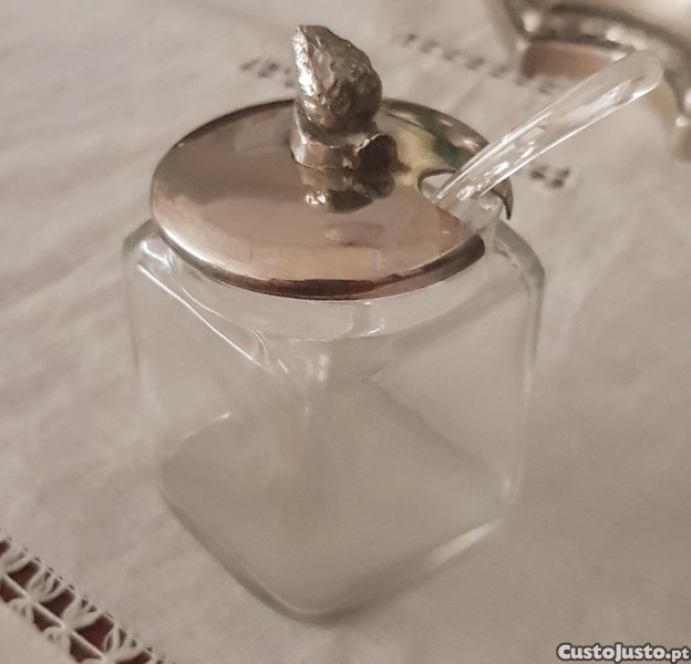 Preço: 15 €Compoteira pequena em vidro c/ tampa em casquinha e colher
