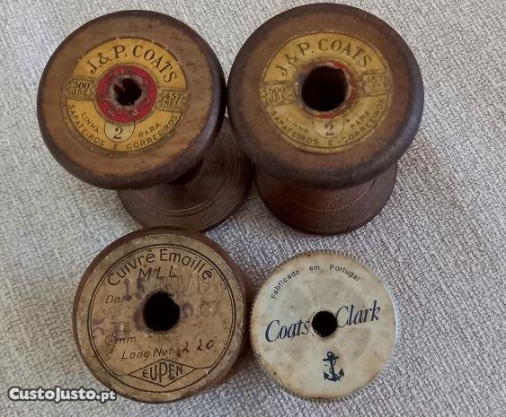 O mais antigo, com data de 15.Nov.1948, foi fabricado pela empresa Eupen e tem a inscrição Cuivre Emaillé o que me leva a pressupor que seja de fabrico belga; os restantes em madeira, são da J.P.Coats, de fabrico português e contém rótulos originais e informações manuscritas, num deles. O que tem estrutura plástica, também é de fabrico português e é da marca Coats & Clrak. Medem entre os 5,5 e os 8 cm, e os diâmetros variam entre 4 e 5,5 cm. Apresentam sinais naturais do tempo, sendo que as de madeira estão melhores que a plástica. Só vendo o conjunto.