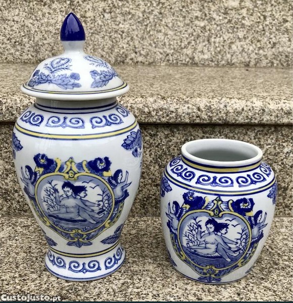 Medidas: Ambas têm cerca de 12 cm de diâmetro máximo e abertura com 7 cm de diâmetro. A jarra tem aproximadamente 25 cm de altura com tampa (ou 19 sem tampa) e o vaso tem 14 cm de altura. Juntas pesam cerca de 1.4 kgs.