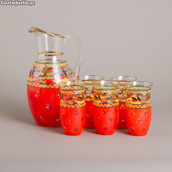 Conjunto de jarro com cinco copos em vidro pintado, decoração policromada.