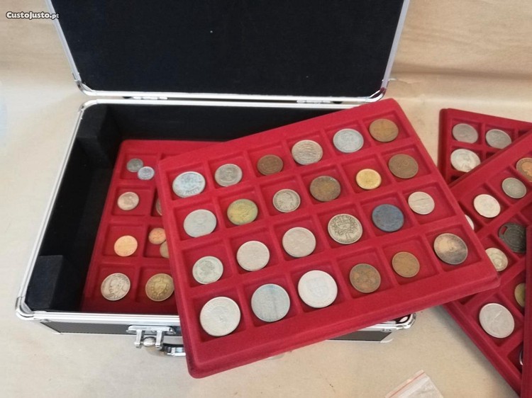 Conjunto de moedas antigas nacionais e estrangeiras com respectiva maleta, em alumínio, de fabrico alemão.